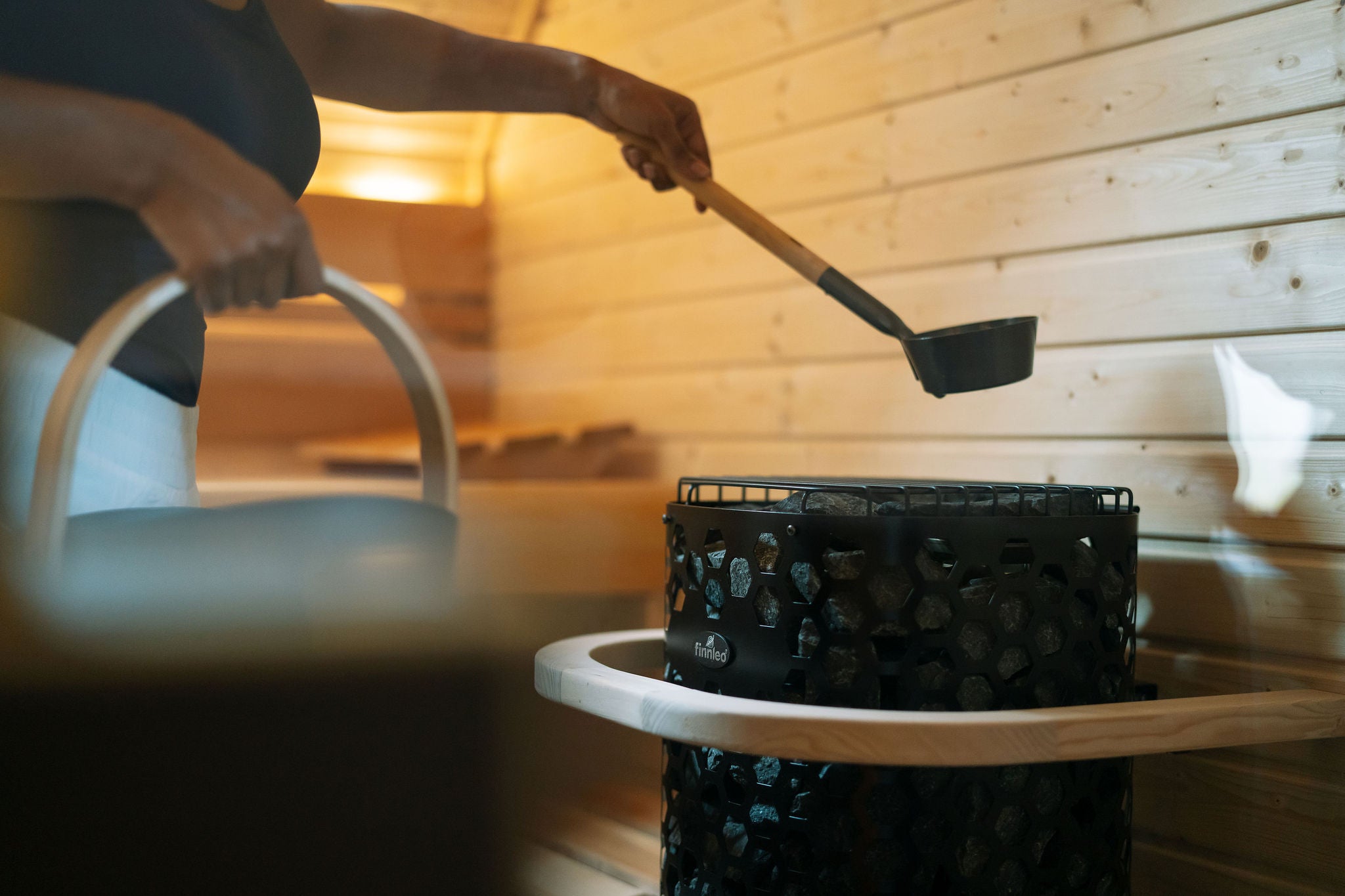 Adding water to your traditional sauna heater is a great way to enhance your heat bath; wetting the heated rocks increases the humidity in the room. Sprinkle one ladle of water on the rocks in your Finnleo traditional sauna heater for a wonderful wet sauna experience. 'Pouring' or 'dumping' water is not recommended; a clear indication that you have used too much water is when is leaks out the bottom of the heater.